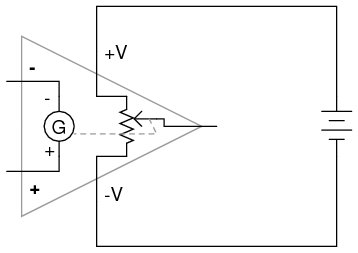 Bear in mind that the above illustration is only a model to aid in understanding the behavior of a differential amplifier. It is not a realistic schematic of its actual design. The "G" symbol represents a galvanometer, a sensitive voltmeter movement. The potentiometer connected between +V and -V provides a variable voltage at the output pin (with reference to one side of the DC power supply), that variable voltage set by the reading of the galvanometer. It must be understood that any load powered by the output of a differential amplifier gets its current from the DC power source (battery), not the input signal. The input signal (to the galvanometer) merely controls the output.