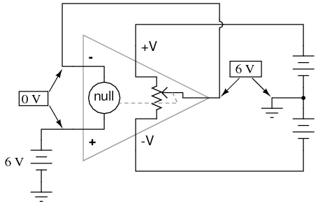 Going back to our differential amplifier model, we can think of the operational amplifier as being a variable voltage source controlled by an extremely sensitive null detector, the kind of meter movement or other sensitive measurement device used in bridge circuits to detect a condition of balance (zero volts). The "potentiometer" inside the op-amp creating the variable voltage will move to whatever position it must to "balance" the inverting and noninverting input voltages so that the "null detector" has zero voltage across it: