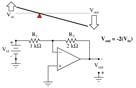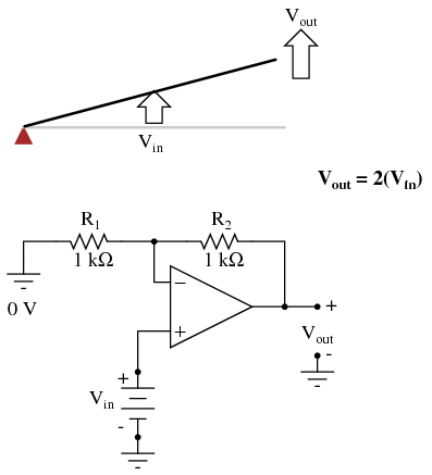 Due to the displacement-amplifying characteristics of the lever, the "output" point will move twice as far as the "input" point, and in the same direction. In the electronic circuit, the output voltage will equal twice the input, with the same polarity. Applying a negative input voltage is analogous to moving the lever downward from its level "zero" position, resulting in an amplified output displacement that is also negative: