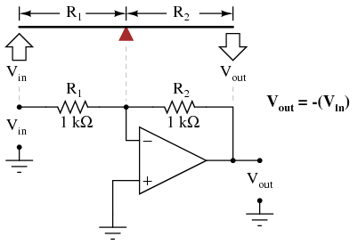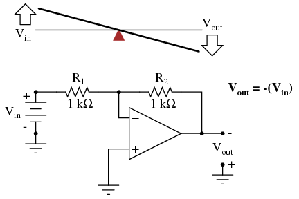 Inverting op-amp circuits may be modeled using the lever analogy as well. With the inverting configuration, the ground point of the feedback voltage divider is the op-amp's inverting input with the input to the left and the output to the right. This is mechanically equivalent to a first-class lever, where the input force (effort) is on the opposite side of the fulcrum from the output (load):