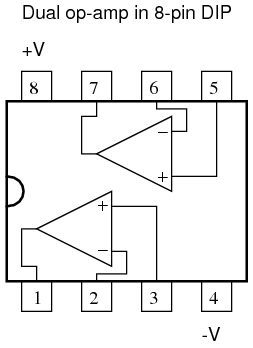 The following diagram shows the pin connections for single op-amps (741 included) when housed in an 8-pin DIP (Dual Inline Package) integrated circuit: