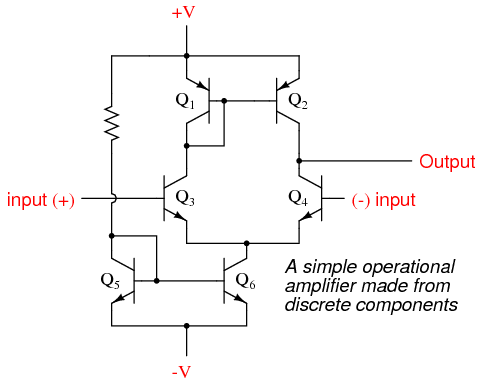 A simple operational amplifier made from discrete components.
