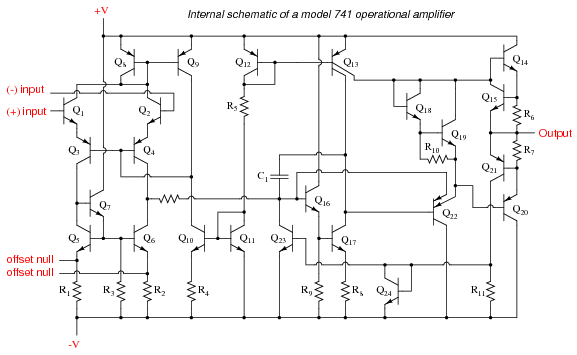 Schematic diagram of a model 741 op-amp.