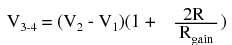 The regular differential amplifier on the right-hand side of the circuit then takes this voltage drop between points 3 and 4, and amplifies it by a gain of 1 (assuming again that all "R" resistors are of equal value). Though this looks like a cumbersome way to build a differential amplifier, it has the distinct advantages of possessing extremely high input impedances on the V1 and V2 inputs (because they connect straight into the noninverting inputs of their respective op-amps), and adjustable gain that can be set by a single resistor. Manipulating the above formula a bit, we have a general expression for overall voltage gain in the instrumentation amplifier: